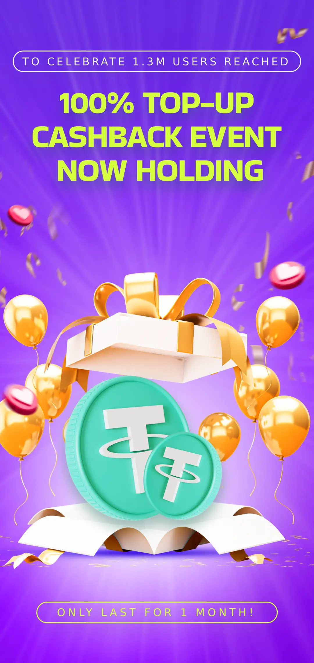 New users who complete a deposit within 7 days of registration have a chance to receive 100% cashback, up to 100 USDT!